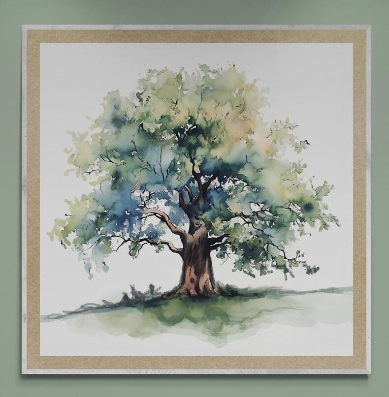 Embracing the allure of nature, this art print invites you to pause, breathe, and marvel at the intricate details that evoke a deep connection with the outdoors. Whether adorning your living room, bedroom, or office, this print emanates a calming and enchanting aura that will infuse your surroundings with a touch of wilderness. Add a touch of nature's magic to your decor and let the Old Forest Tree Watercolor Art Print inspire moments of reflection and appreciation for the natural world.