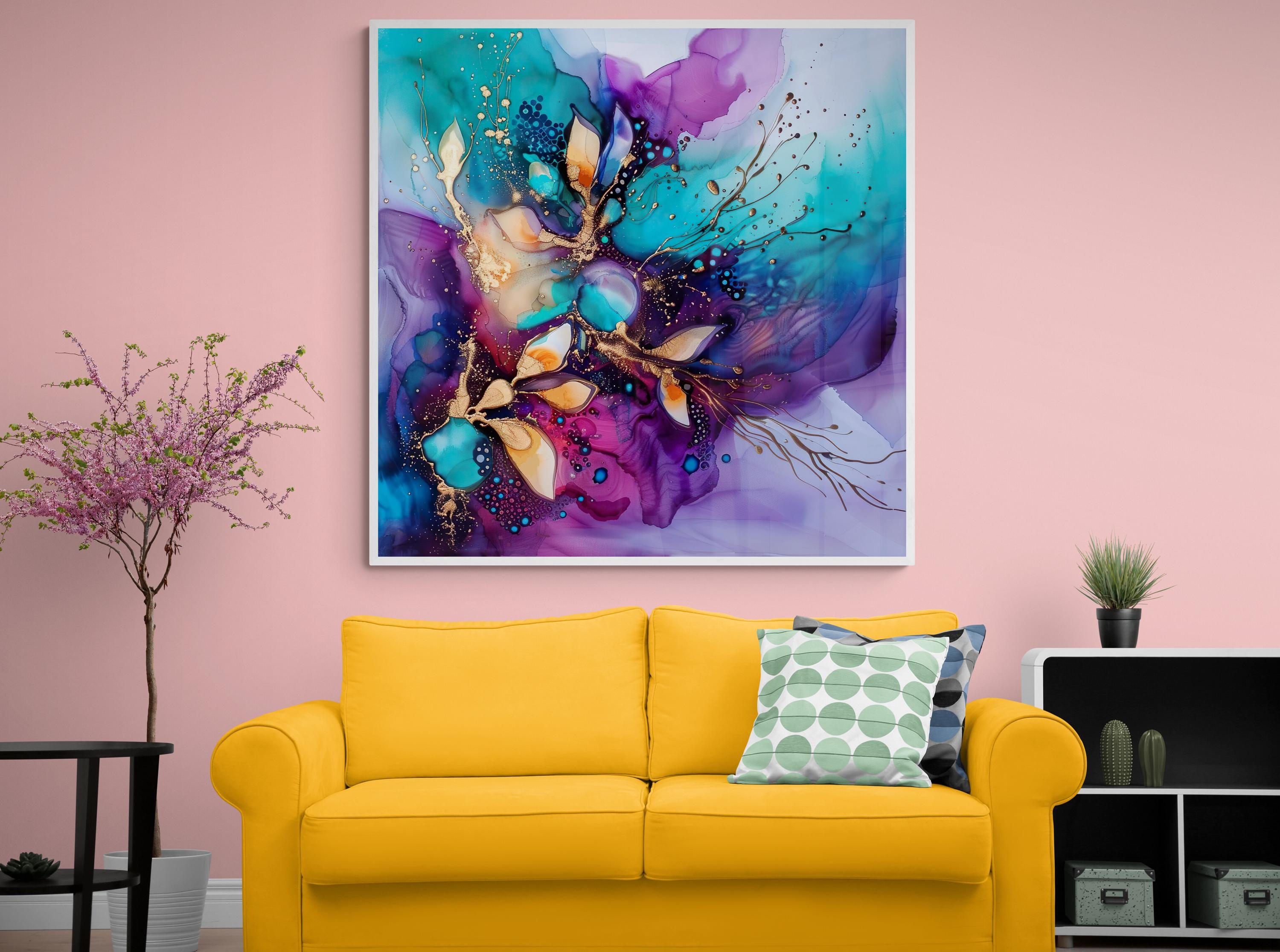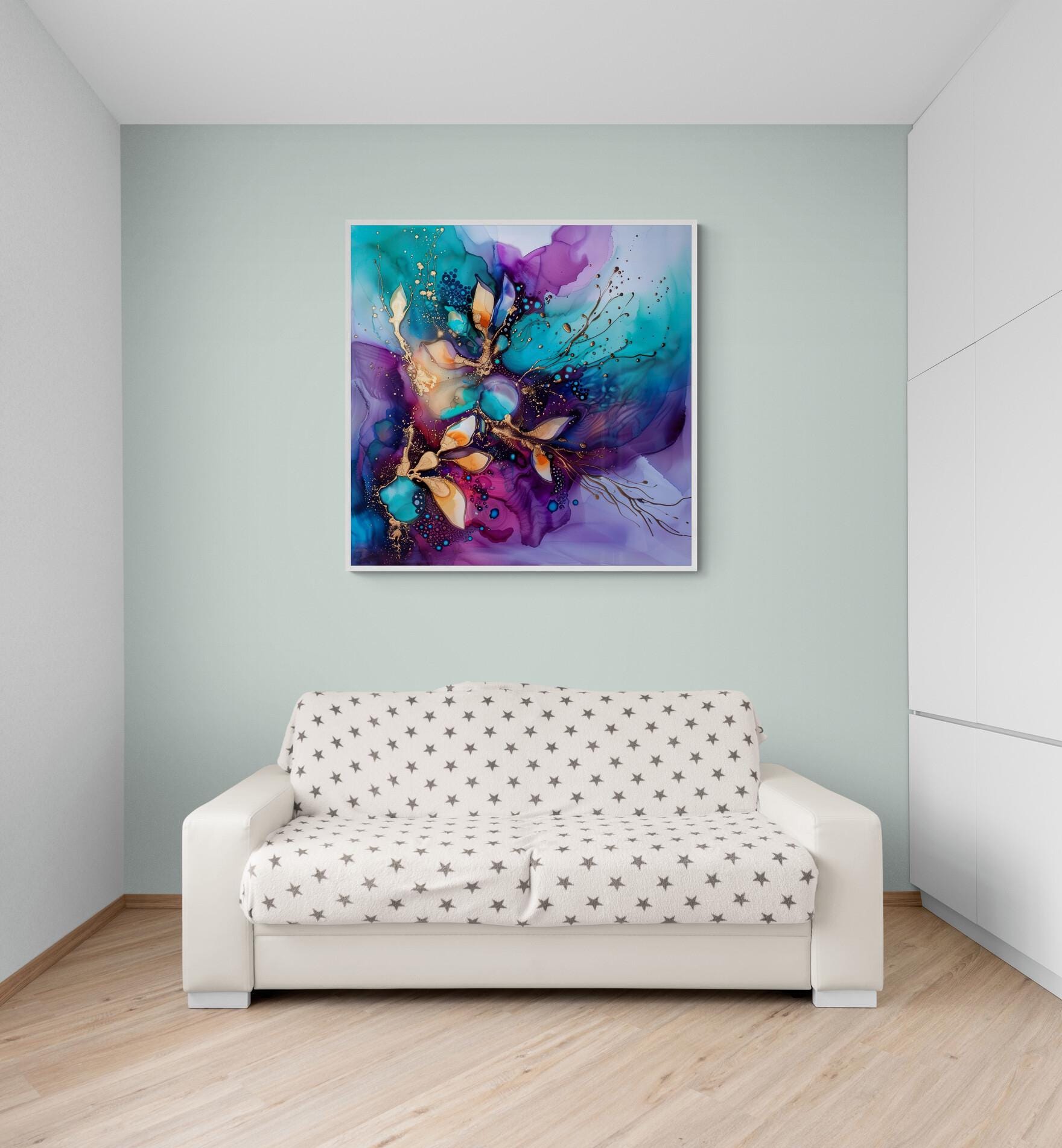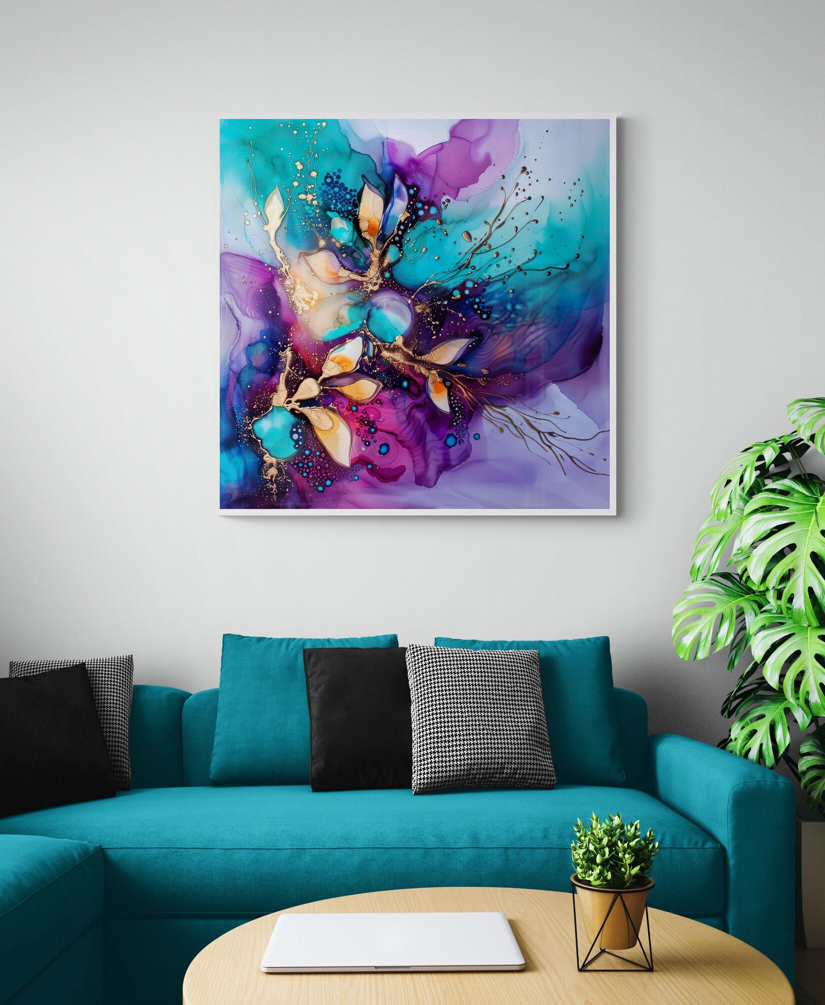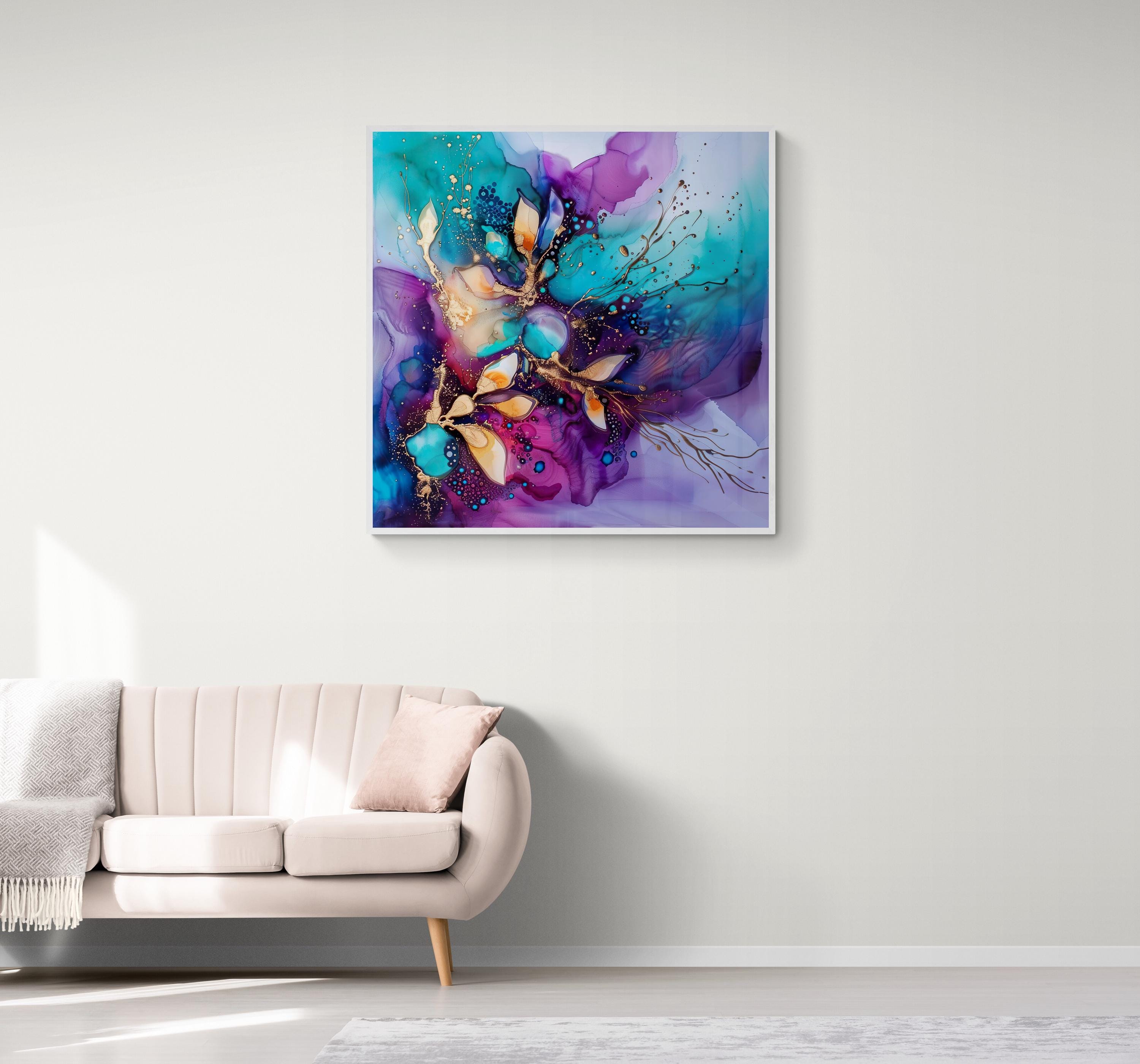 Immerse yourself in a captivating visual journey with this exquisite artwork featuring a mesmerising abstract design of Radiant Whispers. Vibrant hues of blue, purple, metallic gold, and orange converge harmoniously, creating a striking interplay of colors that draw the eye in. Crafted with precision and artistry using alcohol ink, each stroke and blend is a testament to the artist's skill and creativity. This piece exudes a sense of depth and movement, inviting contemplation and reflection with every gaze. Perfect for adding a touch of sophistication and intrigue to any space, this artwork is sure to spark conversations and inspire admiration. Elevate your surroundings with this unique masterpiece that speaks to the power of abstract expressionism