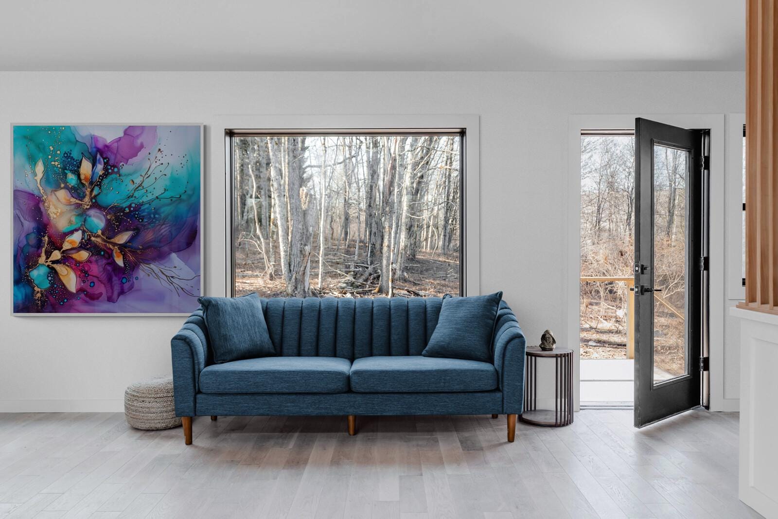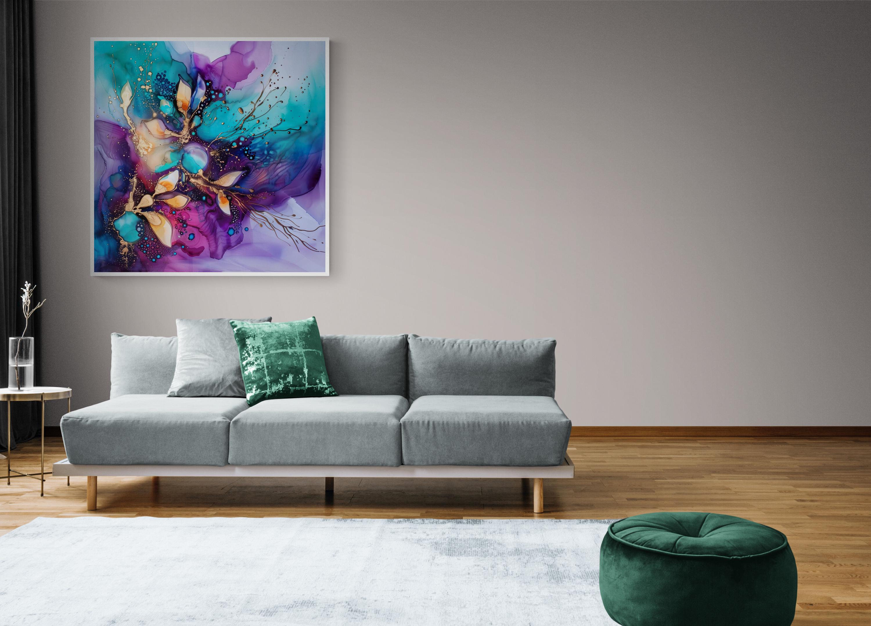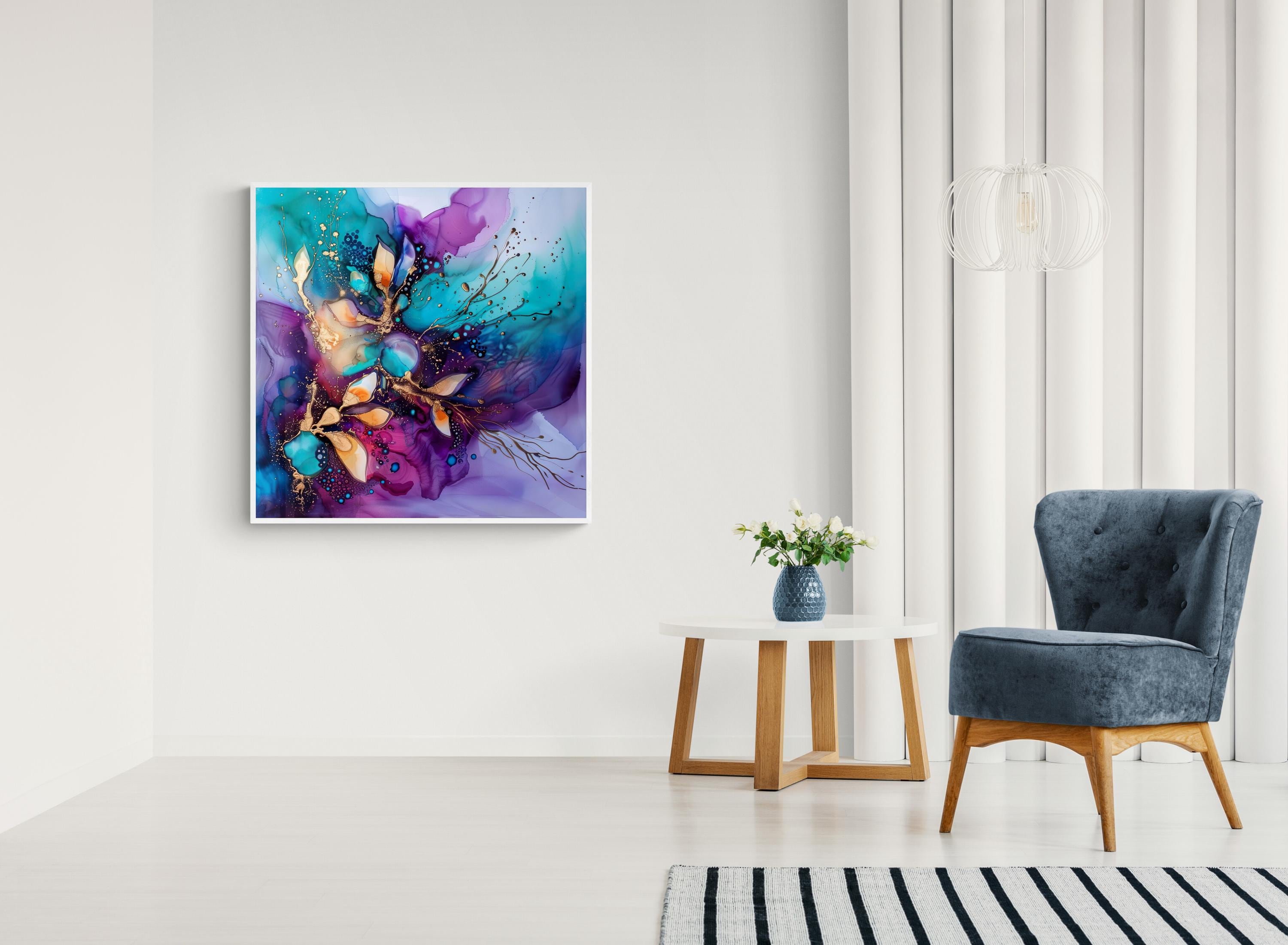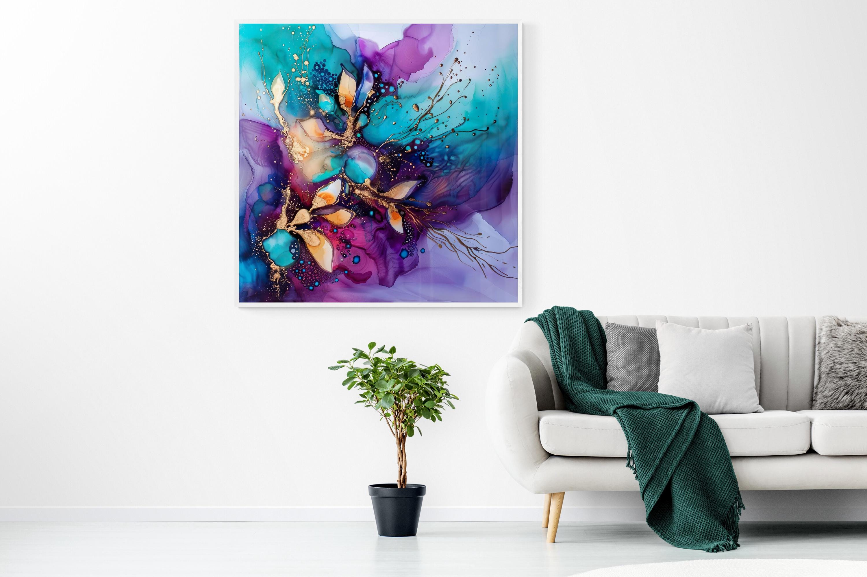 Immerse yourself in a captivating visual journey with this exquisite artwork featuring a mesmerising abstract design of Radiant Whispers. Vibrant hues of blue, purple, metallic gold, and orange converge harmoniously, creating a striking interplay of colors that draw the eye in. Crafted with precision and artistry using alcohol ink, each stroke and blend is a testament to the artist's skill and creativity. This piece exudes a sense of depth and movement, inviting contemplation and reflection with every gaze. Perfect for adding a touch of sophistication and intrigue to any space, this artwork is sure to spark conversations and inspire admiration. Elevate your surroundings with this unique masterpiece that speaks to the power of abstract expressionism
