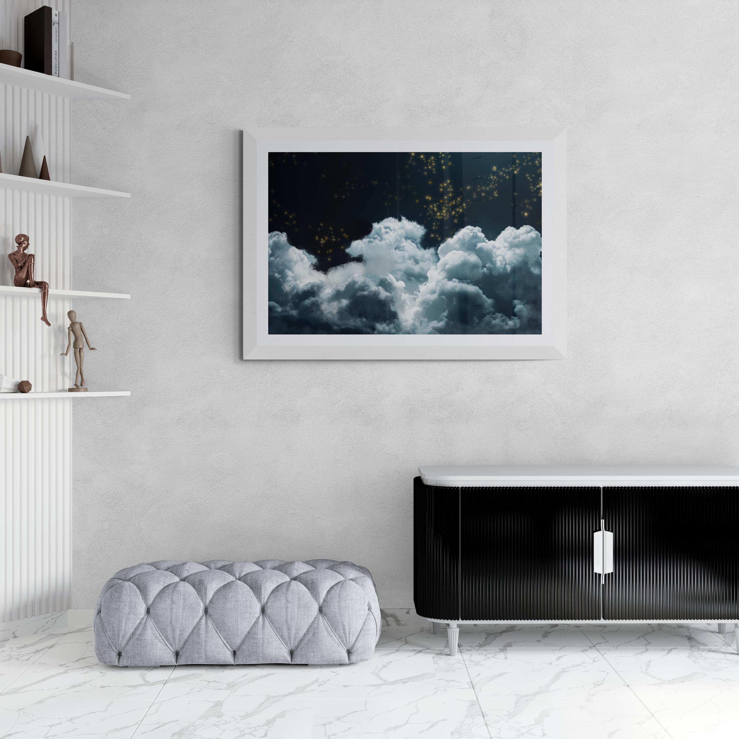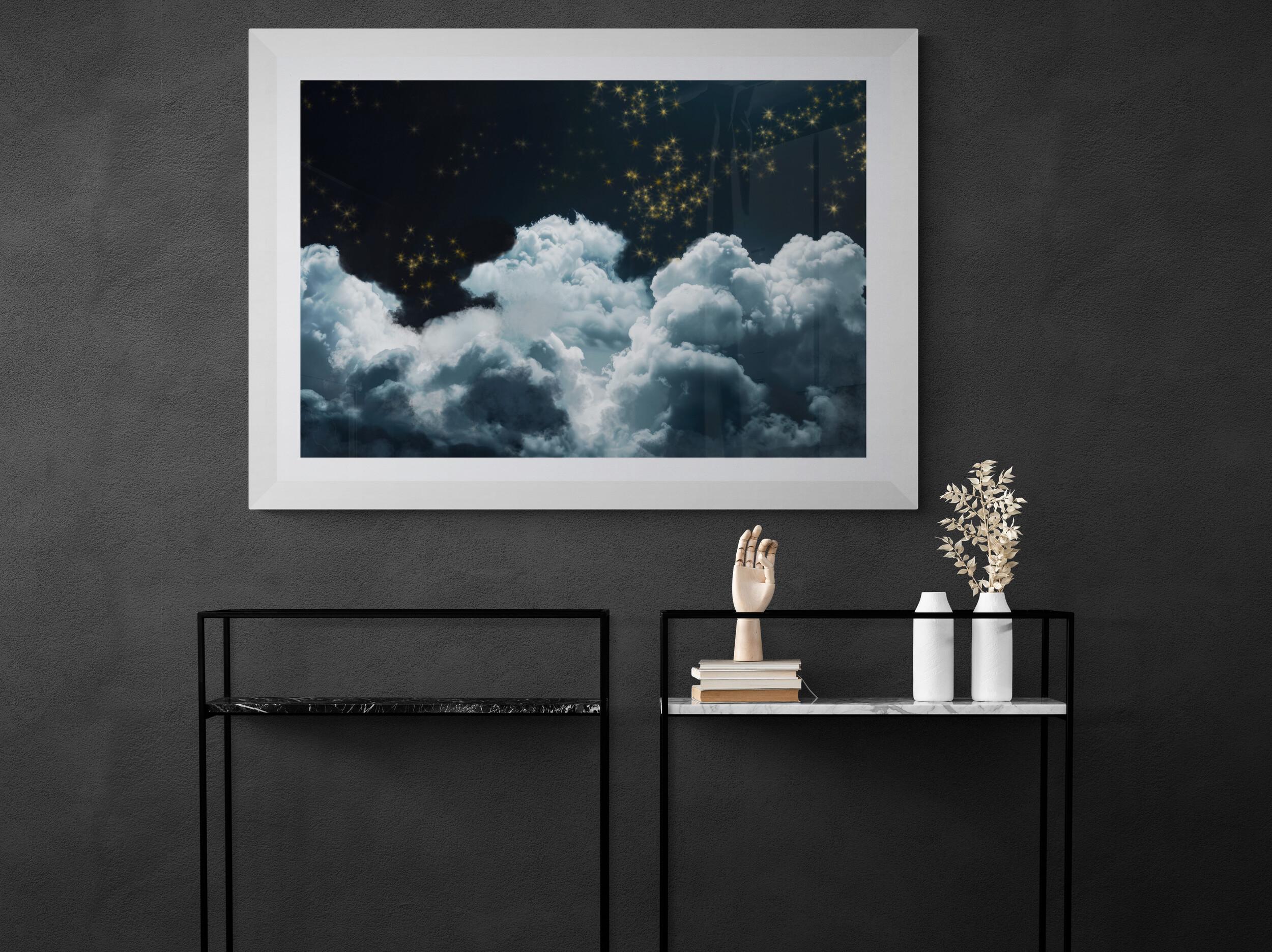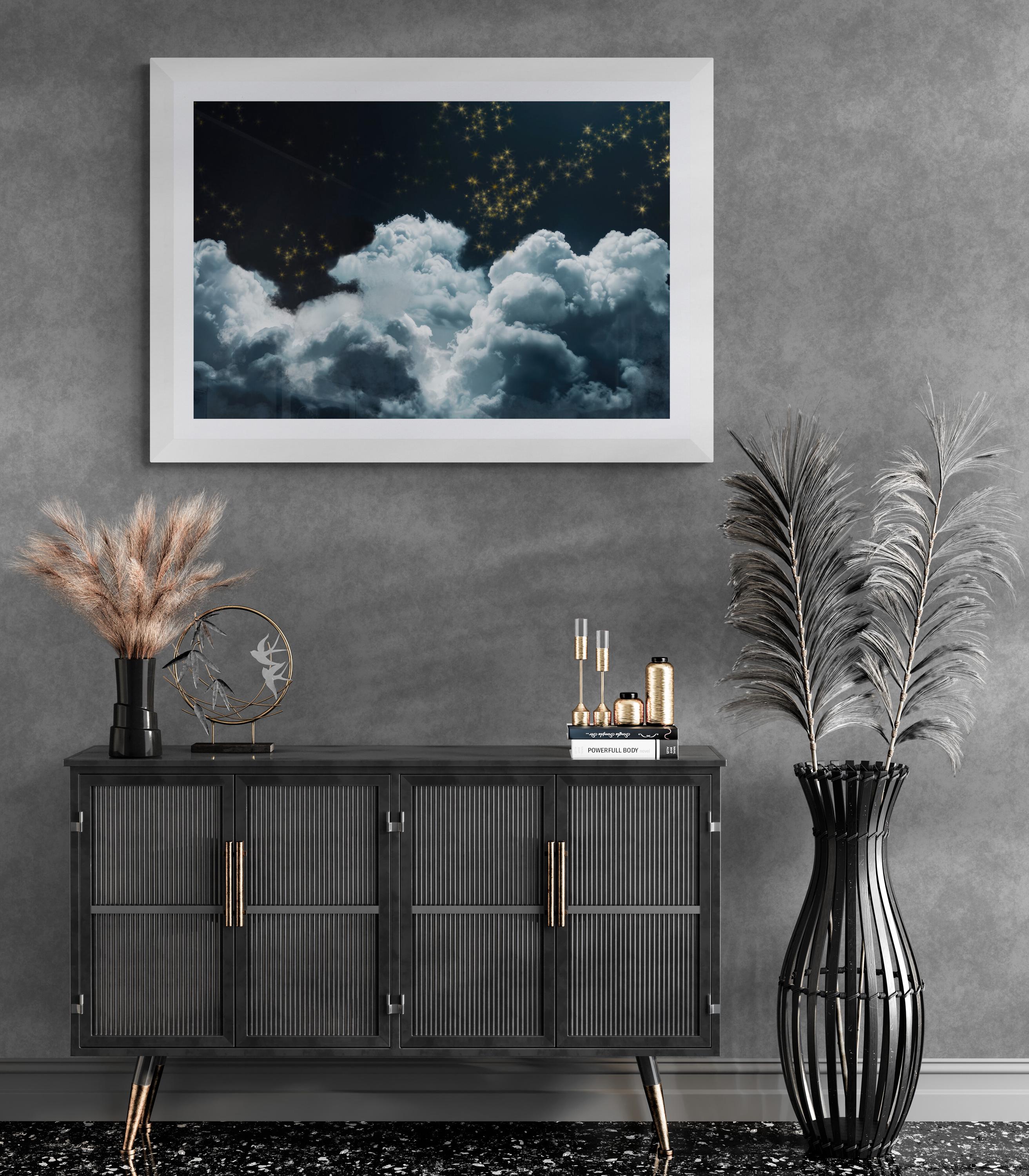Step into a world of tranquility with the Cumulus Night clouds on a black backdrop. This mesmerising piece invites you to immerse yourself in the serene beauty of a starry night sky captured in artwork. The dreamy clouds exude a sense of calmness and mystery, evoking a feeling of peace and wonder. Displaying this piece in your space allows you to bring a touch of celestial charm indoors, creating a soothing ambiance. Let the beauty of the night sky inspire and relax you as you gaze upon this captivating artwork that promises to elevate your surroundings. Immerse yourself in the enchanting allure of Cumulus Night and let its peaceful aura envelop your space in elegance.