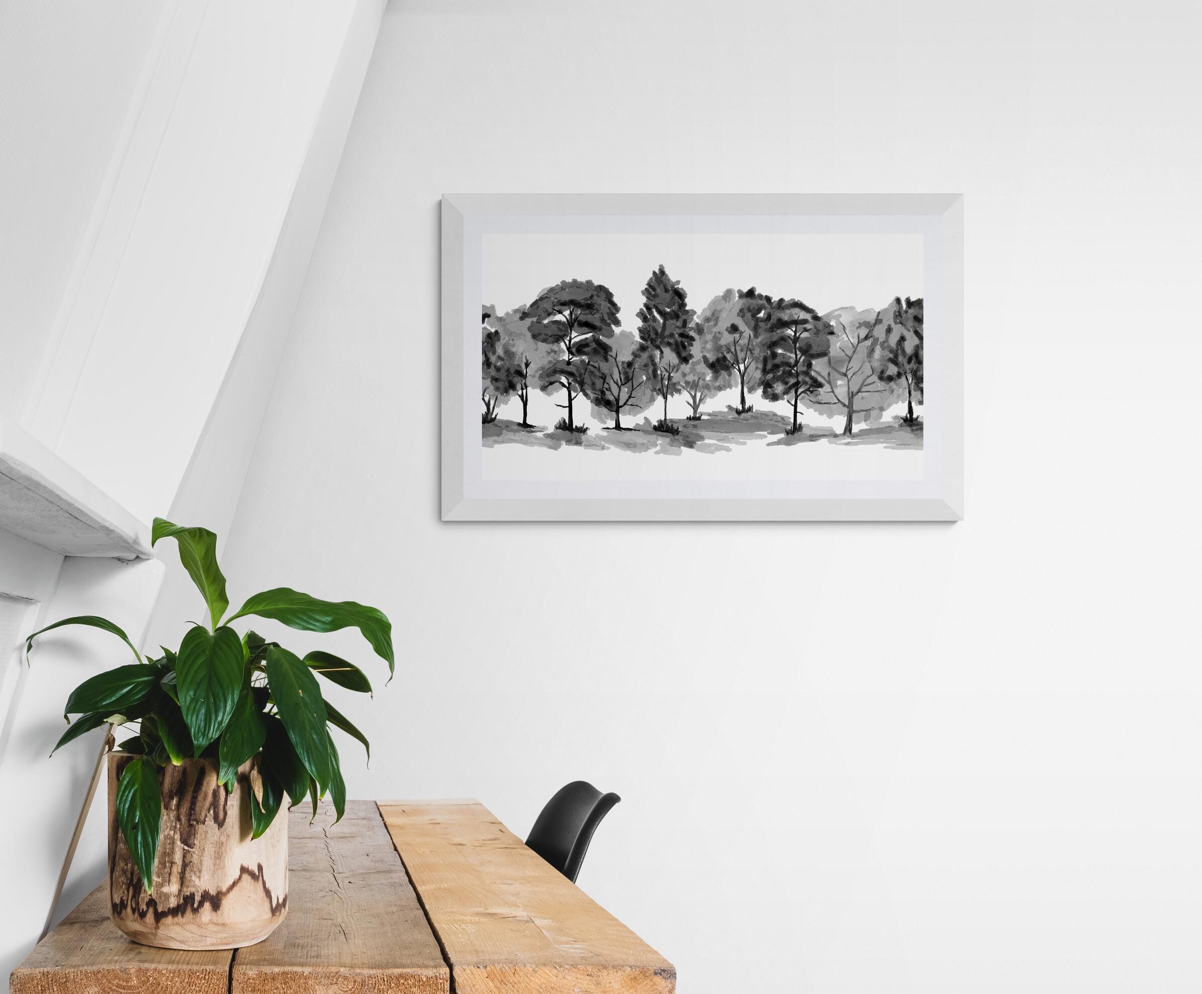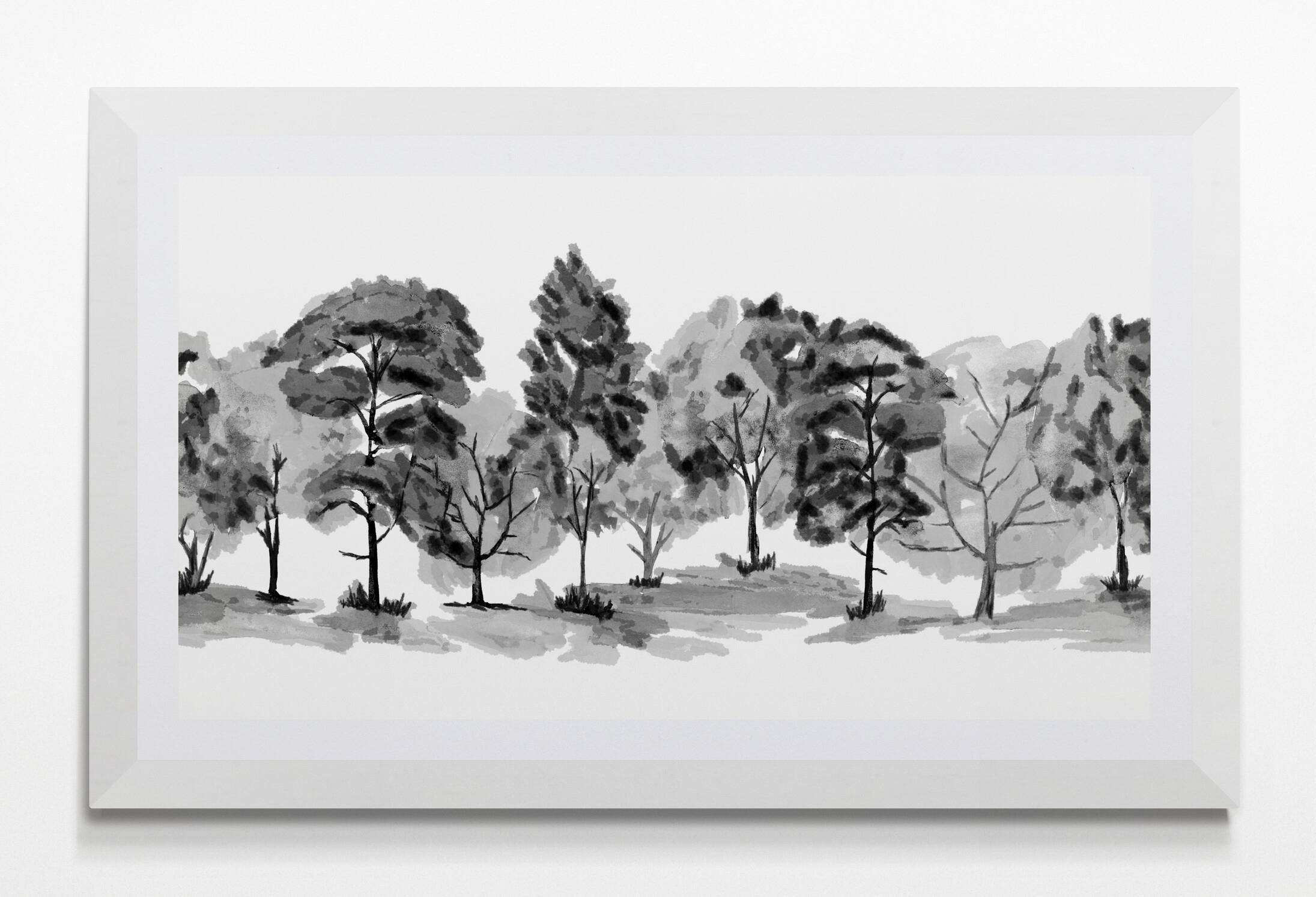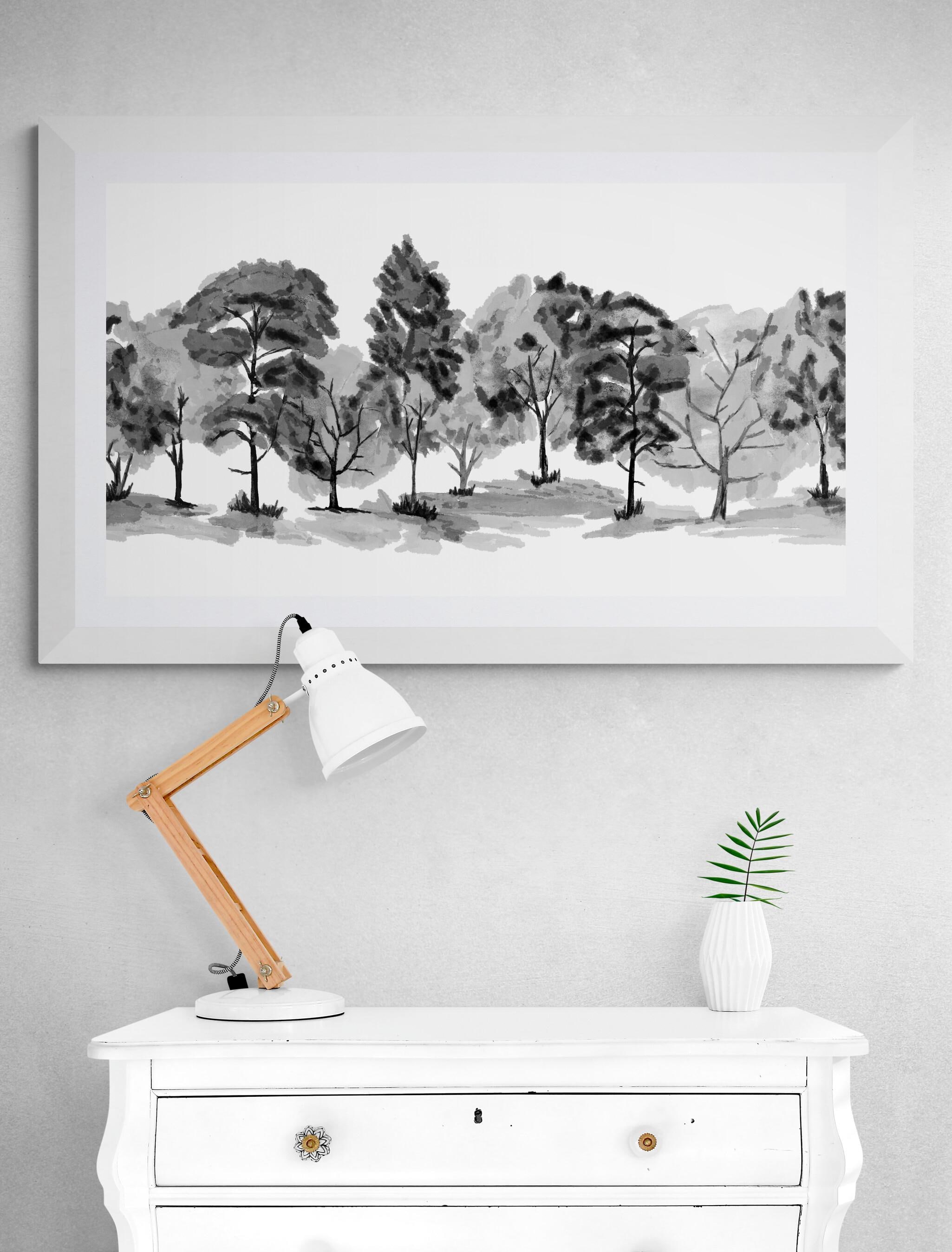 Monochrome Watercolor Autumn Landscape Wall Art, Forest Trees Bushes, Nature Painting