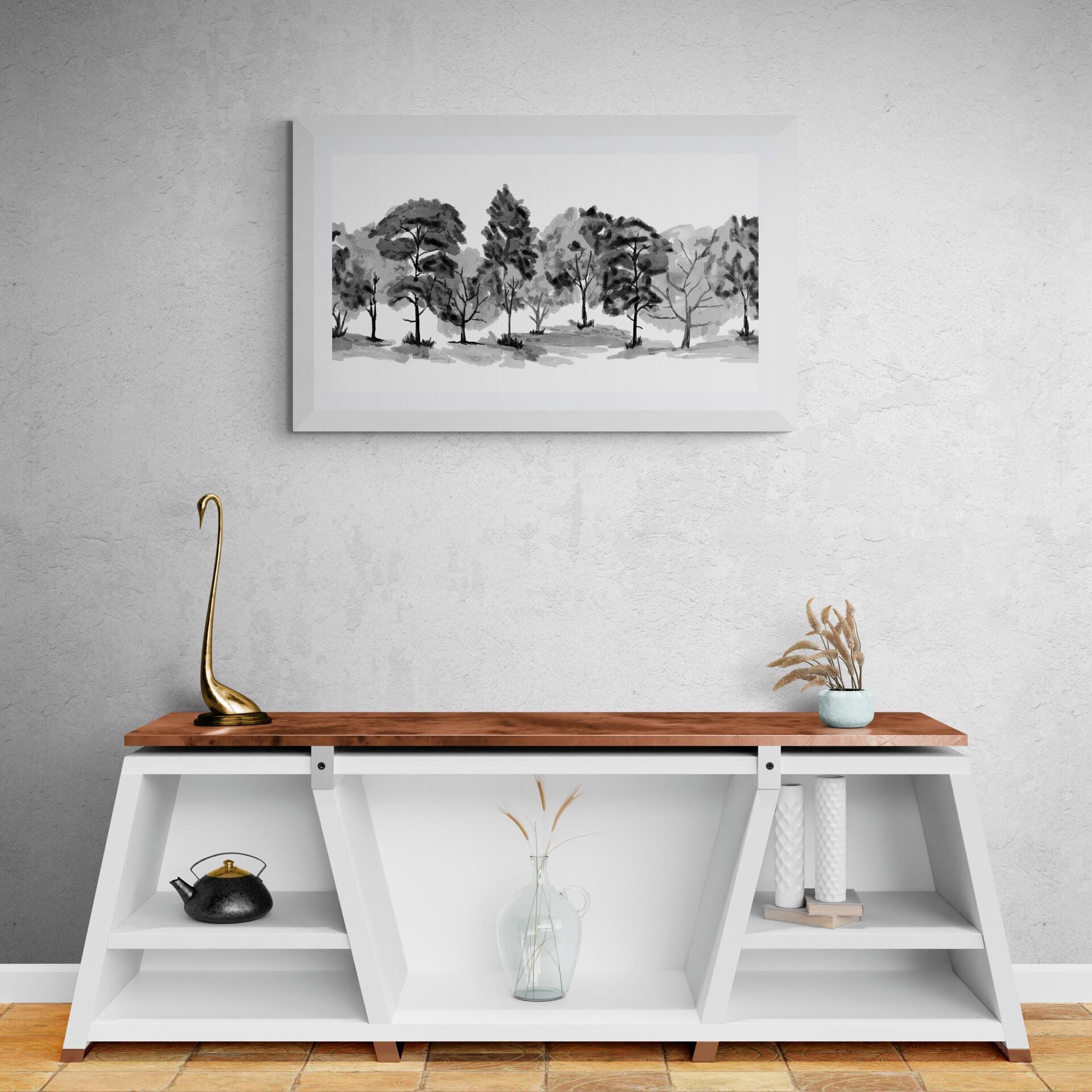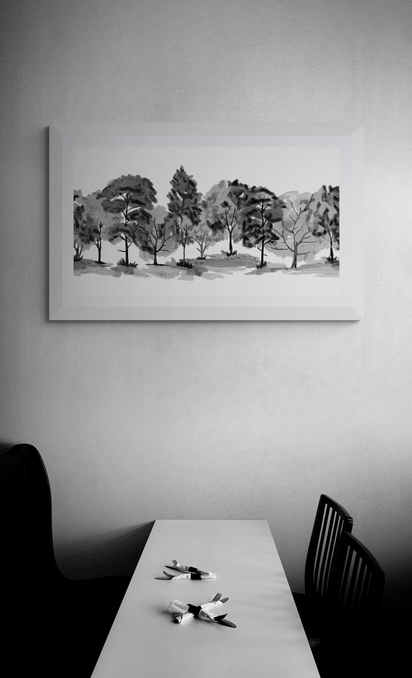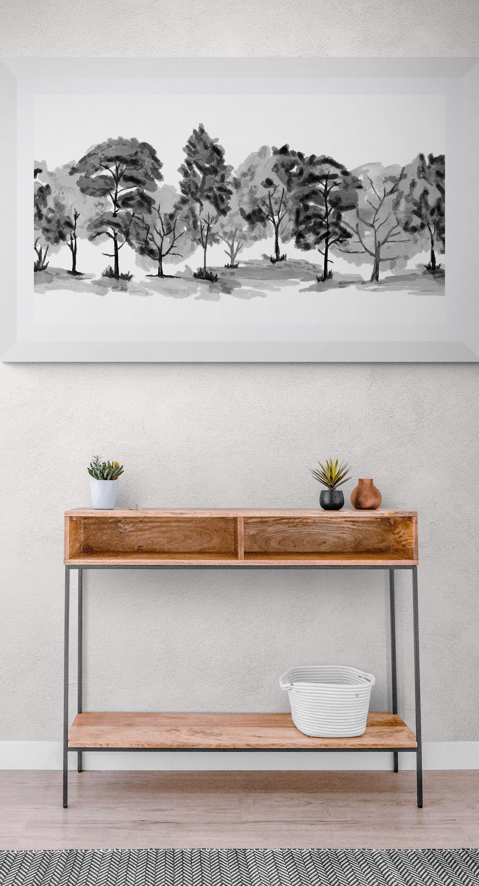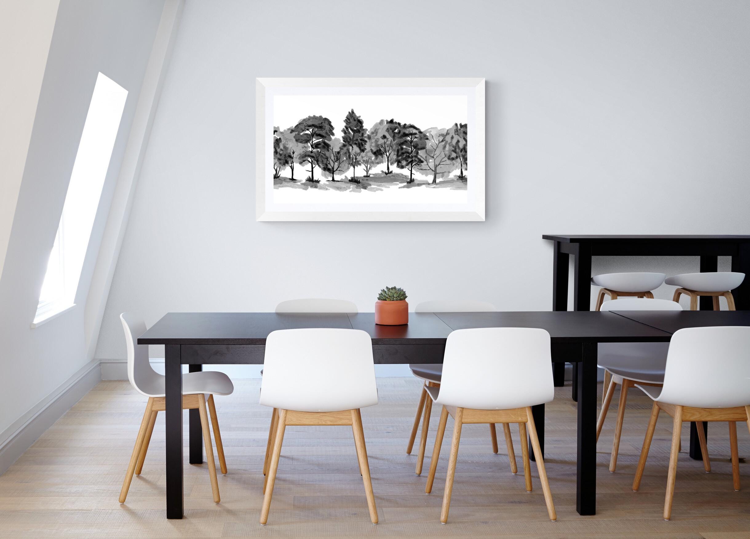 Monochrome Watercolor Autumn Landscape Wall Art, Forest Trees Bushes, Nature Painting