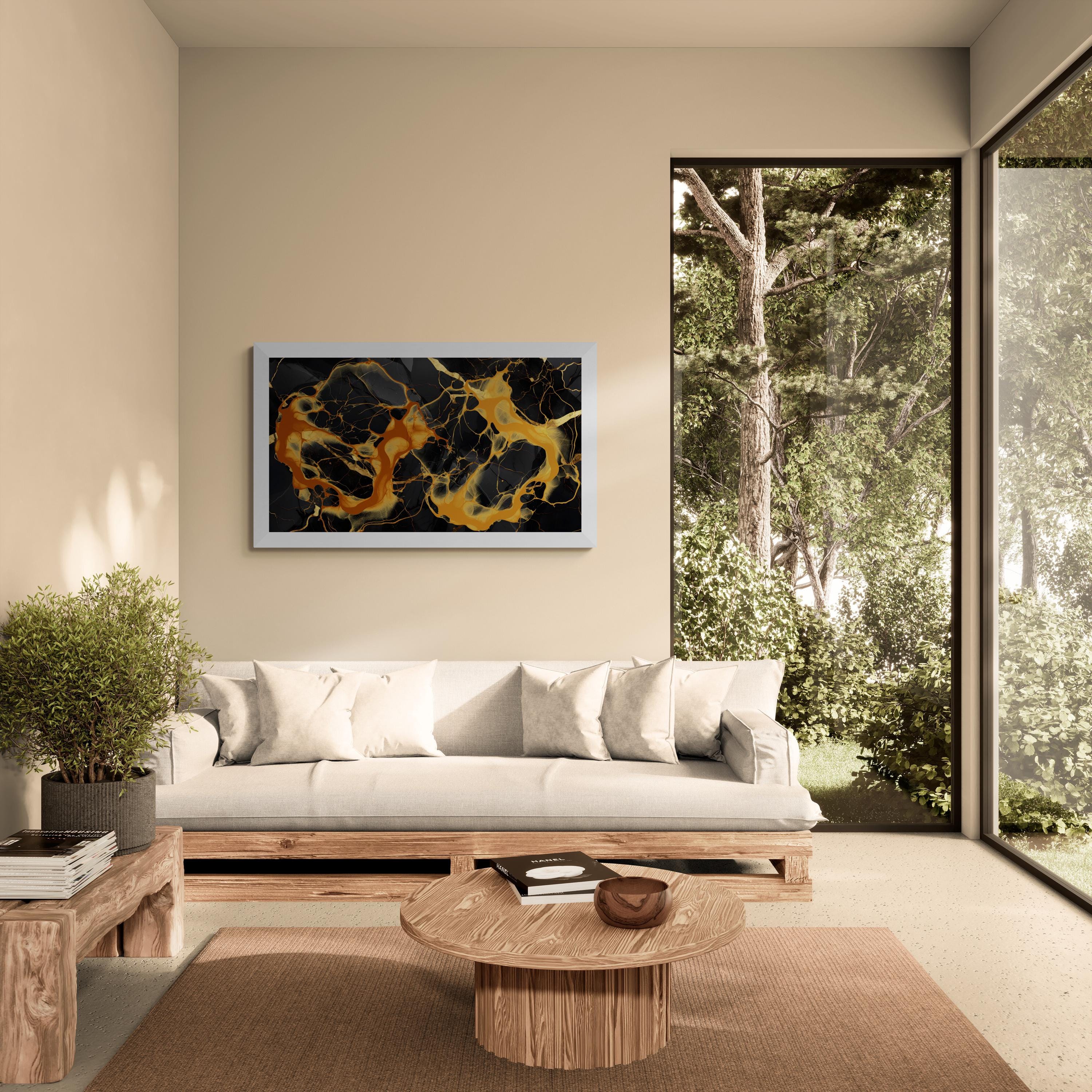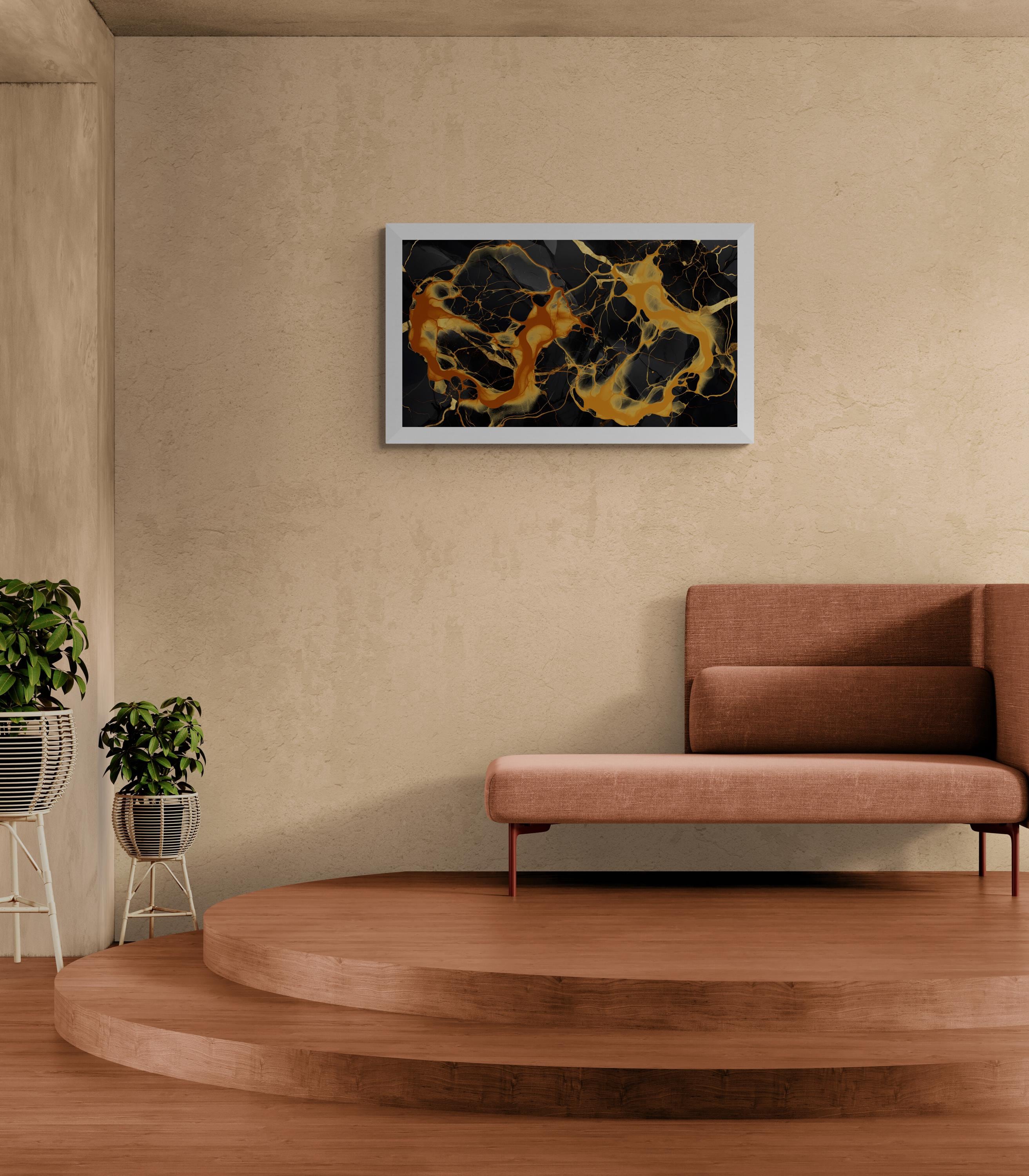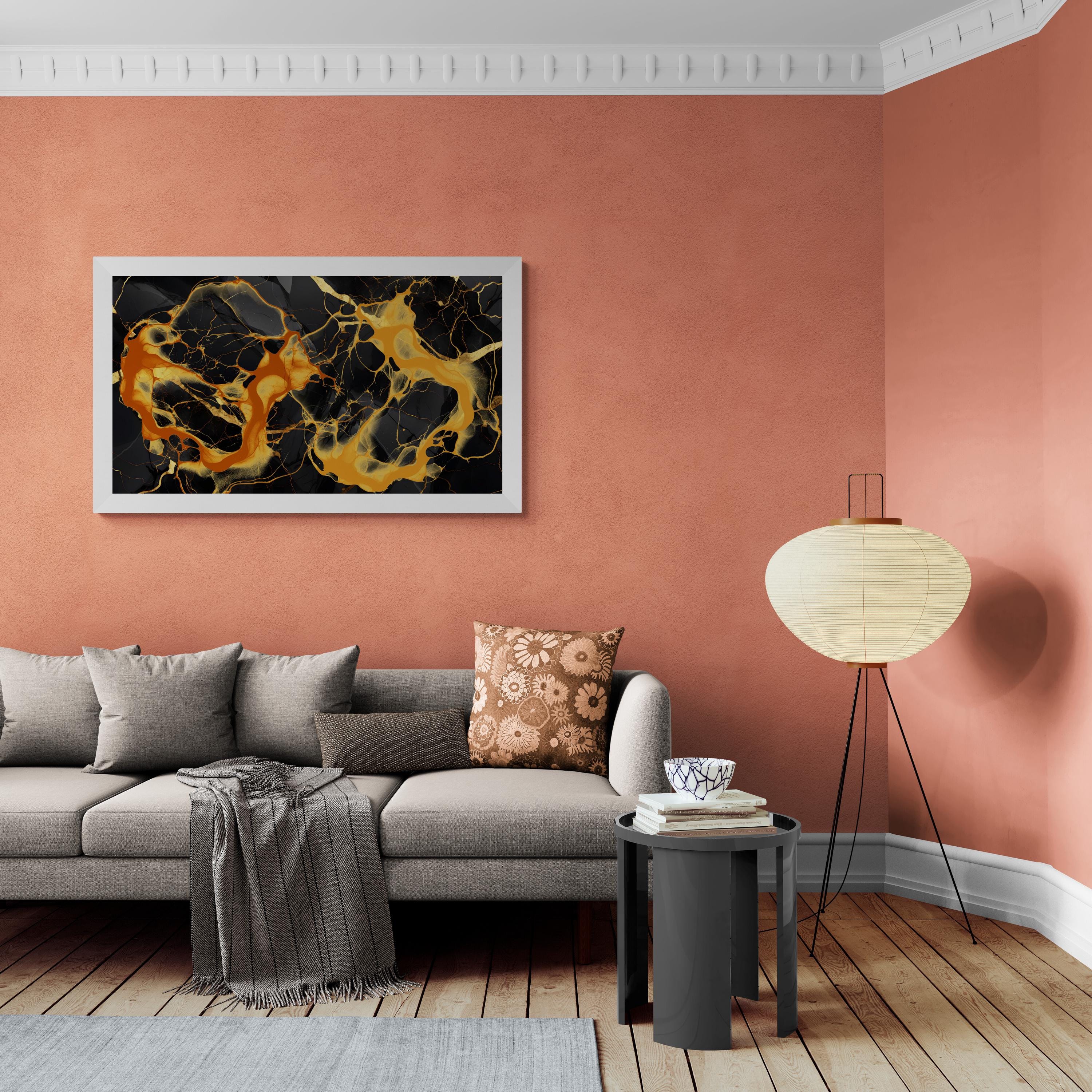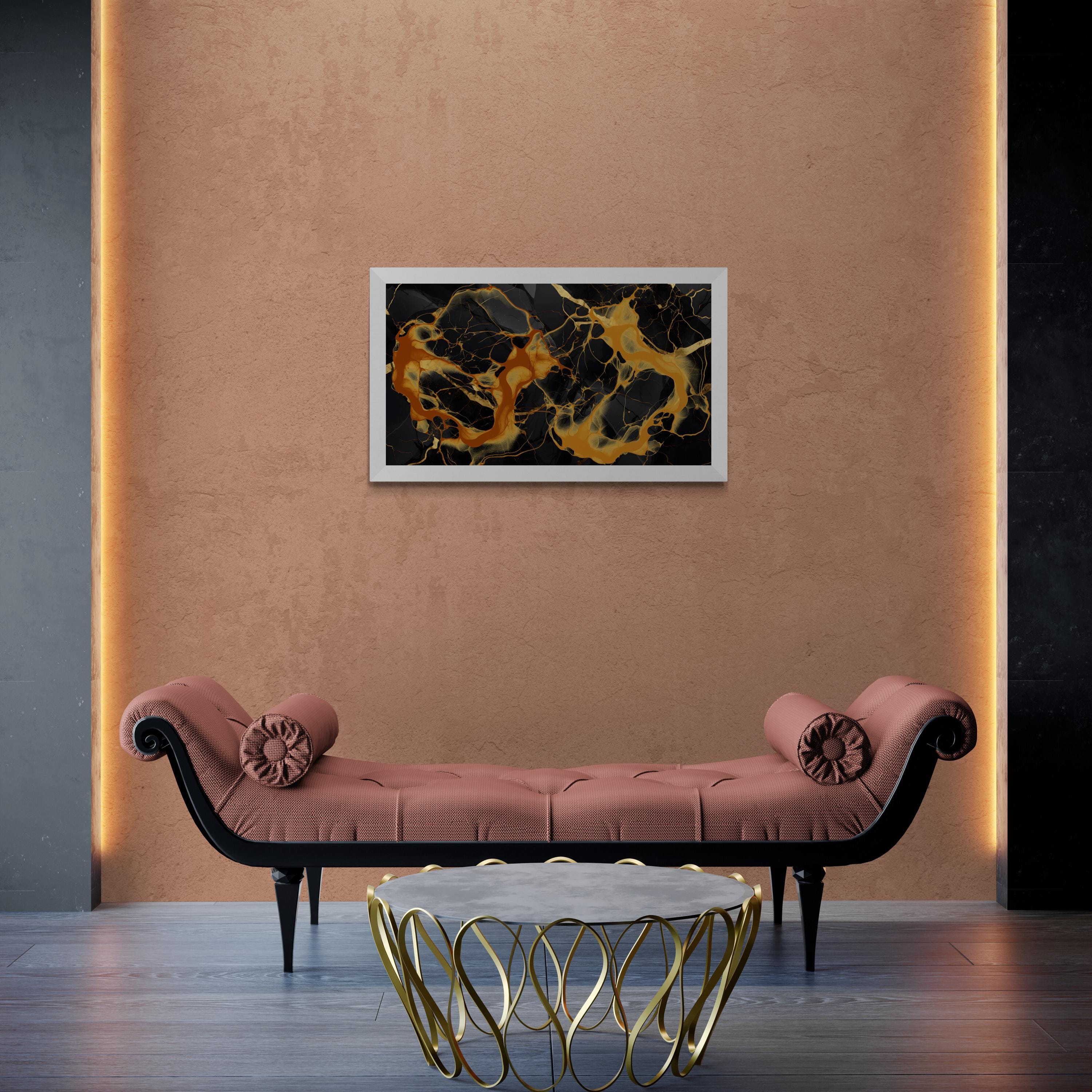 Crafted with finesse and creativity, this captivating artwork showcases a mesmerising abstract composition in rich metallic gold and vibrant orange hues on a black background. Each stroke and swirl come together harmoniously, bringing a sense of depth and movement to the piece. Created using the intricate technique of alcohol ink, the colors blend seamlessly, evoking a sense of energy and warmth. This artwork is a true feast for the eyes, inviting viewers to delve into its intricate details and unique textures. Add a touch of sophistication and elegance to your space with this stunning creation that promises to be a focal point in any room. Embrace the beauty of abstract art and let this piece spark conversations and inspiration in your home or office.